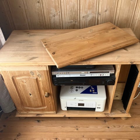 TV-skjenk i heltre furu. Skap i midten med opplegg for utstyr som krever ledninger, og hyller på hver side. Skapet har dør med trykkfunksjon. Opphengslist på baksiden av skjenken, med medfølgende list som monteres på veggen. Åpninger på baksiden mot vegg for ledninger (opp til TV og ned til stikkontakt). Solid og hjemmesnekret. Pusset, oljet og lakket.