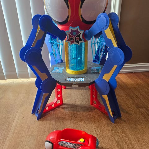 Stor Spidermanbil som kan gjøres om til tårn. Liten spidermanfigur, motorsykkel og trommer følger med. Disse kan kan plasseres i bilen. Laget i hard plast med detaljer som nettmotiv og seter til figuren. Knapp på siden som lager lyd.
