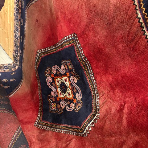 &Tradition teppe i rektangulær form med hovedfarge i rødt og kontrastfelt i grønn/grå tone. Passer som gulvteppe i stue, gang eller soverom der man ønsker et teppe med tydelig mønster og sterke farger. Det har en liten flekk av maling på det som ikke er veldig synlig. Jeg har markert det med blåfarge på bildet. Den blå prikken finnes ikke på ekte.