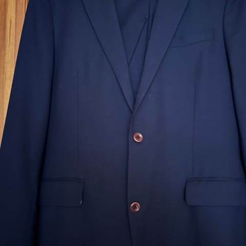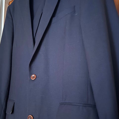 Riccovero dress for herre i størrelse 50. Jakke og bukse er laget av ull og har et klassisk nålestripet mønster i blåtoner. Modellen er dobbeltspent med slag, frontlommer med klaff og brystlomme. Innsiden har flere innerlommer og helfôret konstruksjon. Brukt ved en anledning, lommen på jakken er fortsatt ikke sprettet. Ullstoff av meget god kvalitet, og fargen kan beskrives som klassisk mørk blå. Kommer nok ikke nærmere enn dette for en klassisk blå dress. Ypperlig til konfirmasjon/konfirmasjonsdress, få vil nok være så stilig. Buksa har hemper for belte, men også knapper for bukseseler. Mtp størrelser er jeg 184/80 kg, bruker M i alt av gensere/strikk, 32/32 i jeans og 50/52 i dress/blazer.