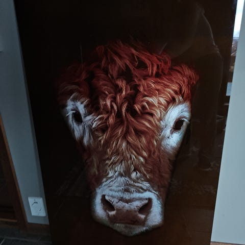 Home veggbilde med motiv av høylandsfe. Bildet måler 70 x 120 cm og er montert på ramme. Motiv i naturfarger med ku i forgrunnen og landskap i bakgrunnen. Egnet som veggdekor i stue, gang eller andre oppholdsrom.