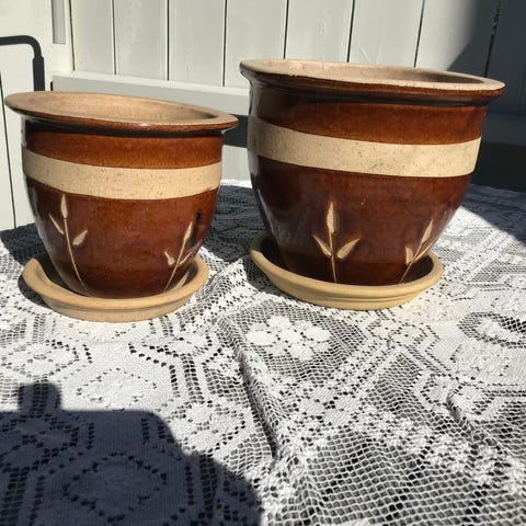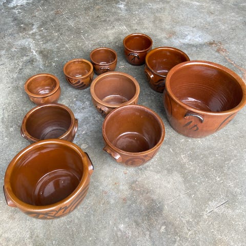 Brun keramikk krukke- og bollesett i ulike størrelser. Settet består av flere krukker og boller i glasert keramikk med mørk brun farge.