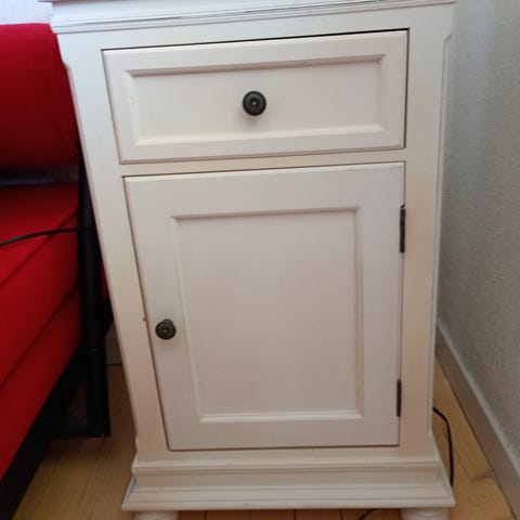 Selger to fine nattbord i hvit. Er en del bruksmerker på begge nattbordene, men den ene toppplata har en del merker og flekker. Dette må pusses og males på nytt