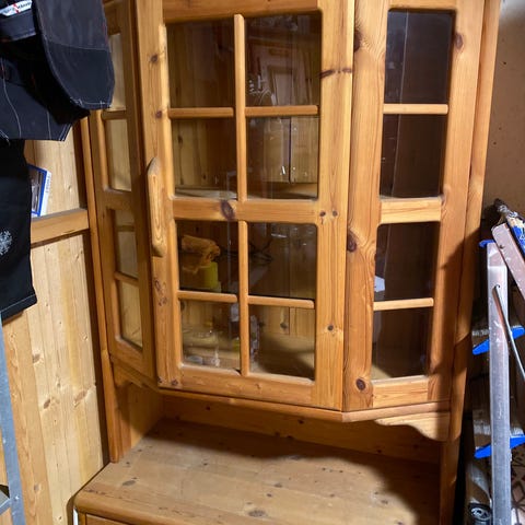 Pent brukt hjørneskap i furu. Glassvindu.