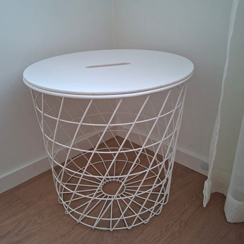 IKEA KVISTBRO sidebord med oppbevaring i hvitlakkert metall. Bordet har rund bordplate i hvit farge med utsparing i midten for enkel av- og påtaking. Understellet består av en åpen trådkurv i metall som gir mulighet for oppbevaring av for eksempel pledd, puter eller blader.