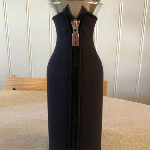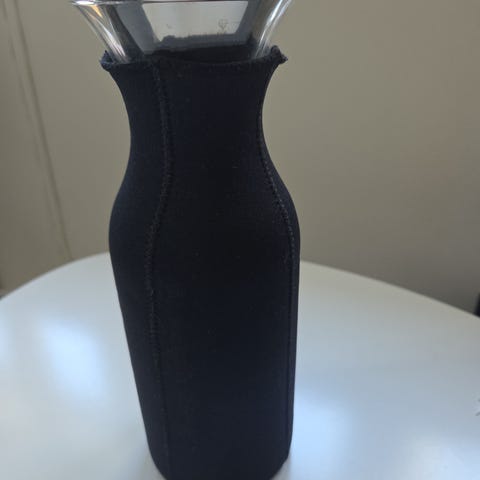 Eva Solo vannkaraffel med avtakbart blått trekk i neopren. Karaffelen er i klart glass med hellekant. Neopren-trekket kan brukes for å holde innholdet kaldt lenger og for å gi bedre grep. Egnet til servering av vann, juice eller andre kalde drikker ved bordet eller i hverdagsbruk.