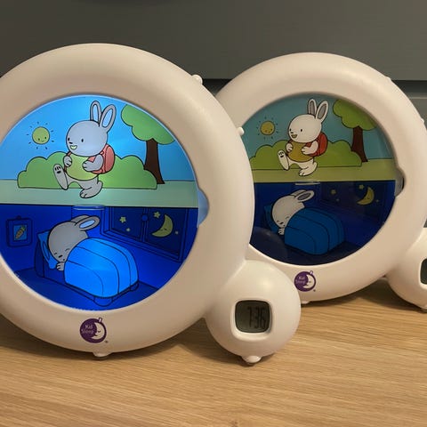 Barnesøvnklokke, Enheten har skjerm som viser dag- og nattscene for å hjelpe barn å forstå når det er tid for å sove og stå opp. På baksiden er det flere knapper for innstillinger og høyttaler for lydfunksjoner. Det følger med strømadapter for tilkobling til stikkontakt. Egnet for bruk på barnerom som visuell søvnindikator og nattlys.