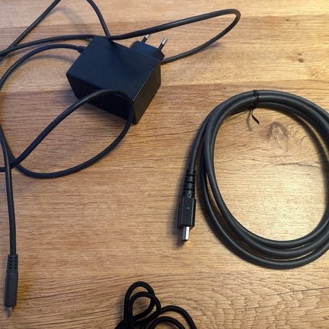 Pakken består av konsoll, dokkingstasjon, strømadapter, joycons og feste til joycons.