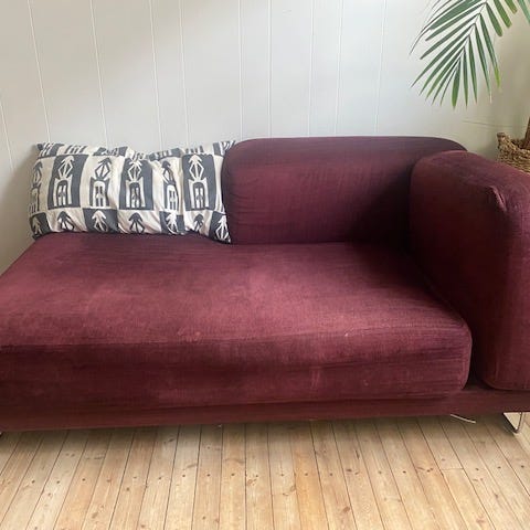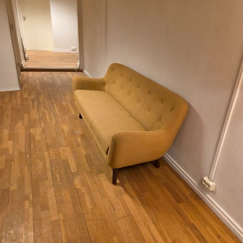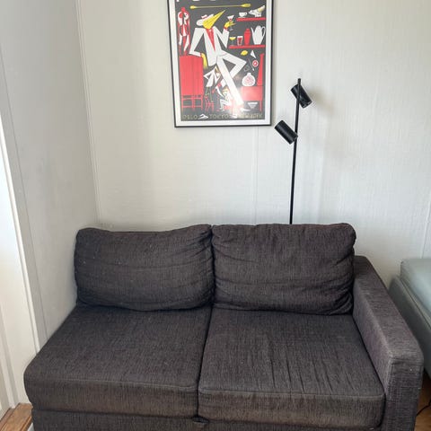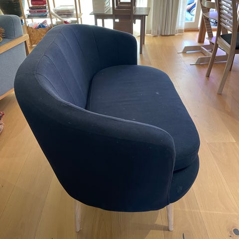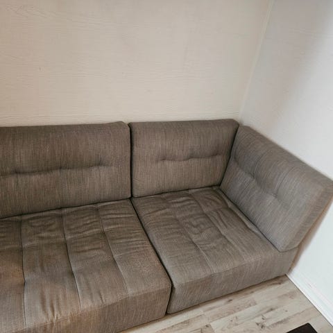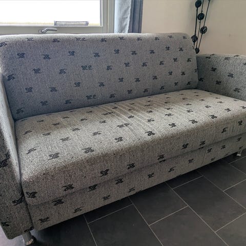 Gir bort liten sofa. Godt brukt, men fortsatt bruk igjen! Putetrekk kan vaskes.