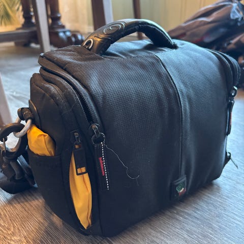 Kameraveske med polstret hovedrom, innvendig lokklomme med glidelås egnet for småting som minnekort, batterier eller kabler. Ytterlommer med glidelås og åpne sidelommer gir ekstra oppbevaringsplass. Vesken har bærehåndtak på toppen og justerbar skulderreim. Den kommer også med regntrekk som ligger i en egen lomme. Passer til speilrefleks- eller systemkamera med tilbehør. Brukt ukelukkende som oppbevaring av objektiver i heimen.