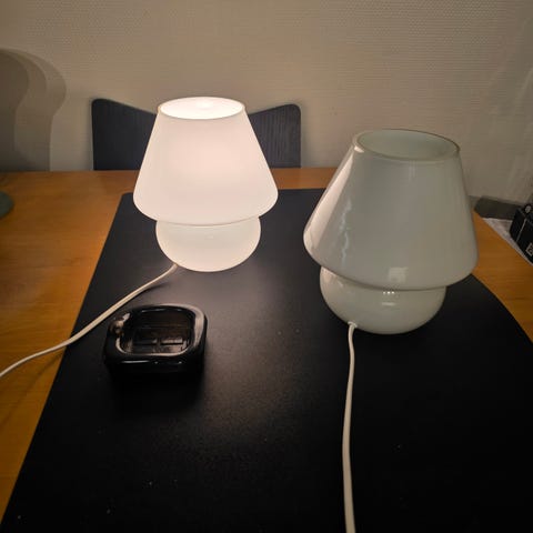 Vintage italienske opalglass soppbordlamper 1970-tallet. Vintage bordlampe i opalglass i klassisk soppform fra 1970-tallet. Lampen er laget i ett stykke formstøpt hvitt opalglass som gir et mykt og jevnt lys når den er tent. Denne typen design var svært populær i italiensk belysning på 60- og 70-tallet og passer fint som nattbordslamper eller stemningsbelysning. Mange av disse ble produsert i Italia eller av det franske selskapet SCE (Société Centrale d'Éclairage) for forhandlere som Habitat. De omtales ofte som "Space Age"-design på grunn av sin futuristiske form.