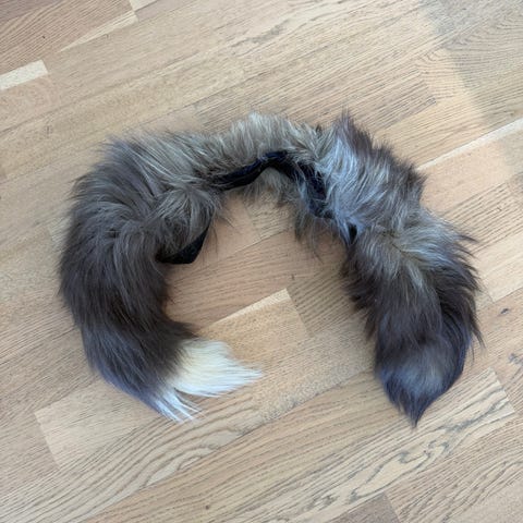 Pelskant til hette med 6 trykknapper. Pelskanten er beige/naturfarget med rød innside og feste med trykknapper. Kan brukes som avtakbar kant på hetter eller krager som har tilsvarende festeanordning.