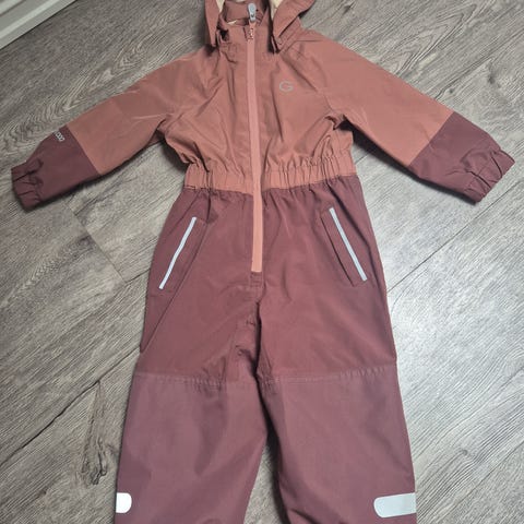 Parkdress i størrelse 98. Brukt noen få ganger og fremstår som ny. 15.000 mm vannsøyle. Reflekser, elastisk strikk i ermer og ben og strikk til fot.