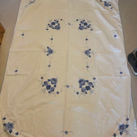 Duk med blomstermotiv 163 x 135 cm. Motivet er trykt på/ikke brodert. Stoffet har noen svak gule flekker.