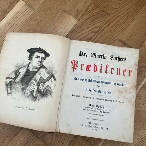 “Dr. Martin Luthers Kirke-Postille, Kristiania 1887, gammel skinninnbundet bok.”