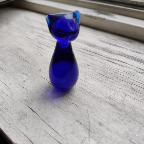 Blå glassfigur i klart og blått glass med hvite detaljer. Dekorativ gjenstand som kan brukes som pyntegjenstand i hylle, vinduskarm eller på bord. Formen er organisk og abstrakt, og figuren står fritt på flat fot. Egnet som interiørdetalj i stue, kontor eller andre rom der man ønsker et lite glassobjekt som dekor.