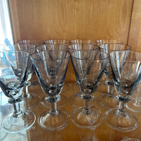 Hadeland Tangen glass servise i klart glass. Bildene viser ulike typer glass, blant annet mindre glass som kan brukes til likør eller dessertvin, og større glass som kan egne seg til vin eller vann. Antall og eksakte størrelser kan kontrolleres mot det som følger med i annonsen eller ved direkte henvendelse til selger.