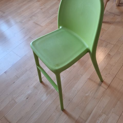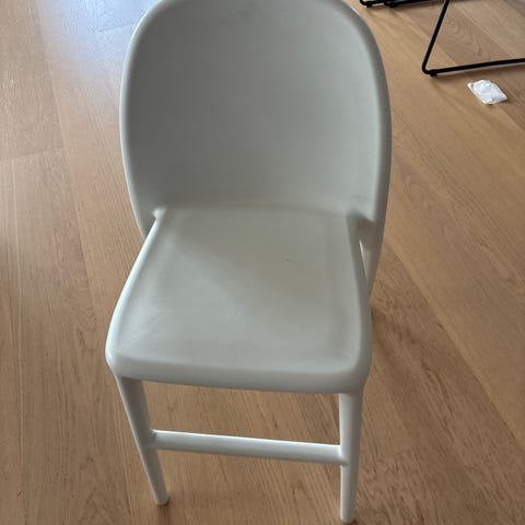 IKEA barnestol i hvit plast. Stolen har hel plastkonstruksjon med ryggstøtte og fotstøtte foran. Egnet for barn som kan sitte selv ved bord, for eksempel på barnerom, kjøkken eller lekerom. Lett å tørke av og flytte på, og kan brukes både til måltider, lek og andre aktiviteter ved bord.
