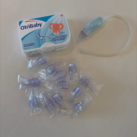 Otribaby nesesuger med engangsfiltre for baby. Settet inneholder nesesugere i etui samt engangsfiltre til bruk ved rensing av nesen hos spedbarn og små barn. Nesesugeren brukes sammen med filtrene for å fjerne slim fra barnets nese. Produktet er beregnet til hjemmebruk av foreldre eller omsorgspersoner i forbindelse med forkjølelse eller tett nese hos baby og små barn.