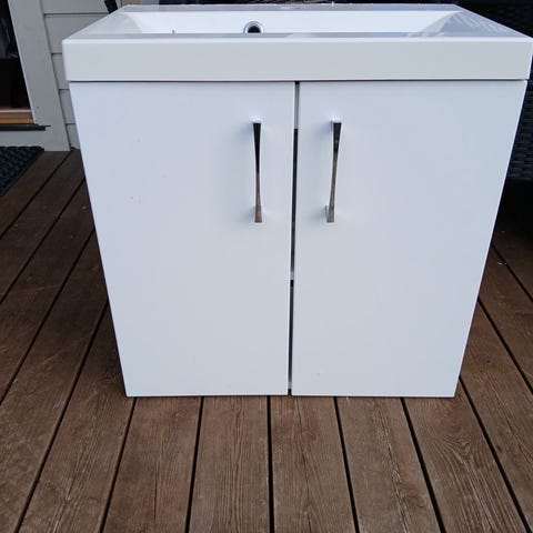 Ifö servant med underskap i hvit utførelse. Servanten har rektangulær kum med overløp og ett hull for ettgreps blandebatteri. Underskapet har to dører med enkle knotter og gir oppbevaringsplass til baderomsartikler. Det er synlig en mindre skade på kanten av servanten. Egnet for montering på bad eller vaskerom der det er behov for kombinert servant og oppbevaringsløsning.