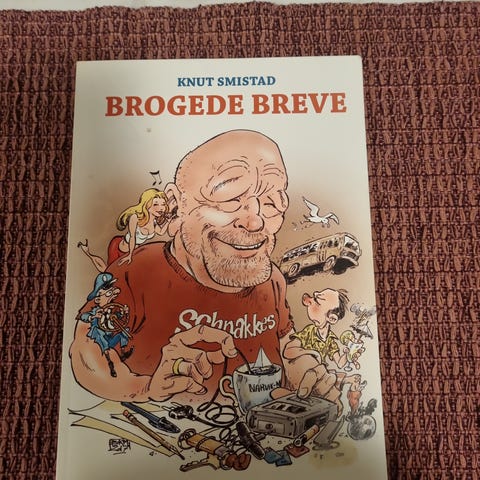 Knut Smistad «Brogede brev» bok. Illustrert omslag med karikaturtegninger. Innbundet utgave med tittelblad og trykt tekst. Egner seg som lesestoff for dem som er interessert i humoristiske tekster og illustrasjoner.