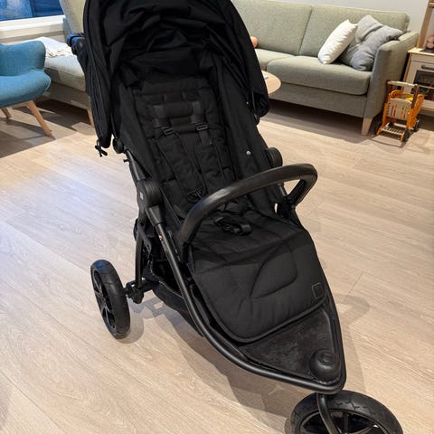 Svart Beemoo airfill duovogn. Brukt som ekstravogn hos oss, til byturer/ferieturer o.l. Vogna har svingbare forhjul, som også kan låses fast. Bakhjulene er luft hjul, som gir en mer komfortabel trillefølelse. Håndtaket er justerbart. Romslig kurv under vogna. Babybagen er nesten ikke brukt. Sportsdelen kan brukes begge veier, så du kan velge om du skal ha barnet vendt mot deg eller fra deg. God og lang kalesje på sportsdelen som skjermer godt.