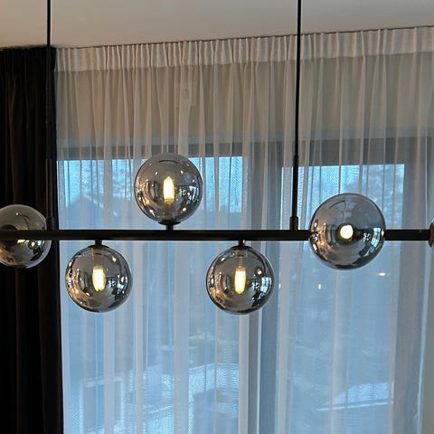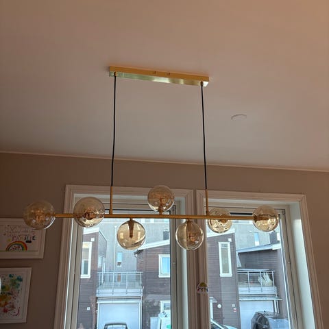 Vernon taklampe amber selges. Kjøpt ny fra Lampehuset. Brukt kun i noen få måneder. Vi har vært veldig fornøyde med denne stilige taklampen. Selges pga flytting da den nye boligen har spotlights. Selges med lyspærene. Lampen er demontert. Dyrefritt og røykefritt hjem. Må hentes.