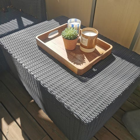 Fin sittegruppe med bord og benker som passer perfekt til terrasse eller balkong. Alle puter følger med (ikke avbildet).