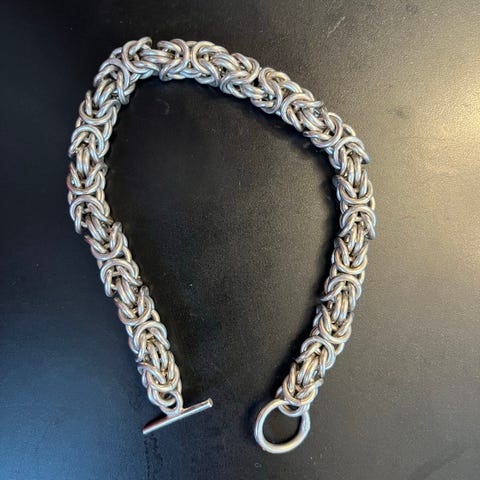 Dette armbåndet ble laget av en kunstner i familien, det er i sølv men har ikke sølvstempel.