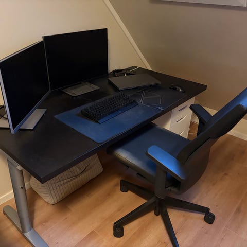 Skrivebord fra IKEA og kontorstol.