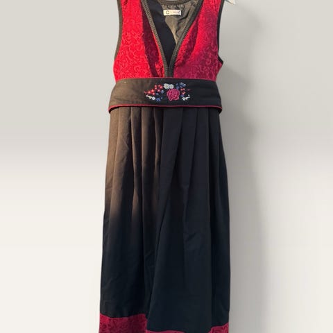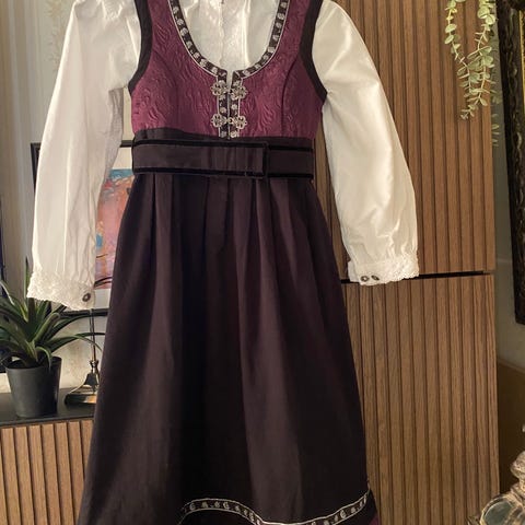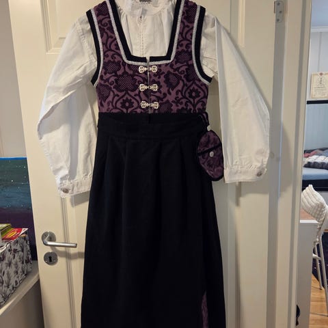 Vakker festdrakt i lilla og sort. Skjorte og forkle følger med. Vakre detaljer på overdel og i stakken. Plass til sølje i halsen. Pent brukt.