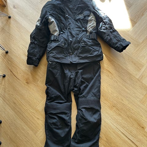 Bullfighter sett med jakke, bukse, hjelm og hansker i svart farge. Jakken er en tekstil motorsykkeljakke med flere lommer og justeringsmuligheter på ermer og liv. Buksen er en tekstil motorsykkelbukse med forsterkede partier ved knær og lår, samt glidelås og stramming i livet. Hjelmen med klart visir uten riper eller merker. Hanskene er korte motorsykkelhansker med harde knokebeskyttere og forsterkede partier i håndflate og fingre.