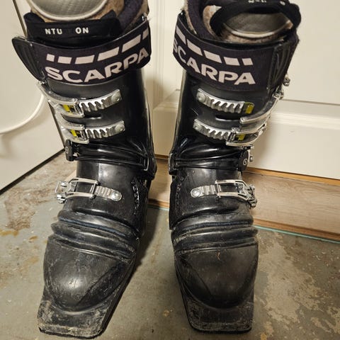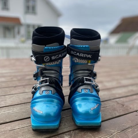 Scarpa T2 telemarkstøvler i svart plastskall med grå detaljer. Støvlene har flere justerbare spenner. Modellen har gåfunksjon bak på skaftet og gummisåle som gir godt feste ved gange. Passer til telemarkkjøring i bakke og på tur med kompatible telemarkbindinger. Str 38. Må hentes😊
