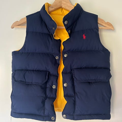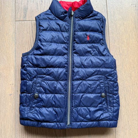 Polo Ralph Lauren vest i størrelse 10-12 år. Vesten kan brukes på begge sider. Har kommet et lite rift foran på vesten som er teipet. Se bilde.