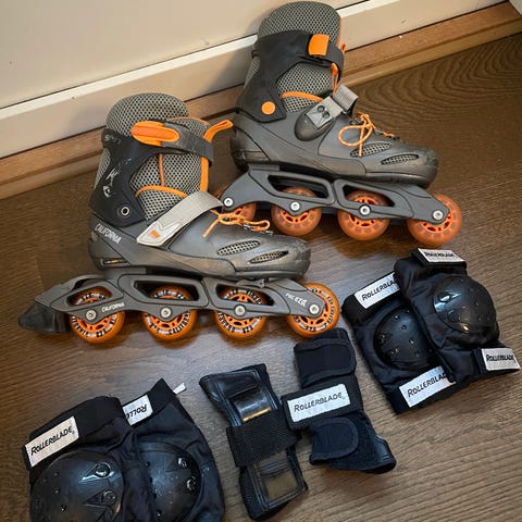 Settet inkluderer også beskyttelsesutstyr i svart med harde plastskall, blant annet kne- og albuebeskyttere samt håndleddsbeskyttere.