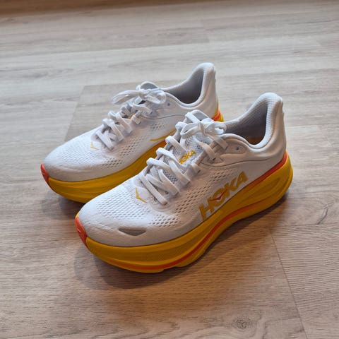 Hoka Clifton 10 i størrelse 40 i hvit farge. Modellen har overdel i pustende mesh med snøring foran og polstret pløse og hælkappe for økt komfort.