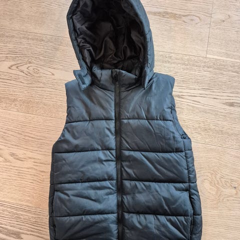 Vattert vest for barn i størrelse 140 cm (ca. 9–10 år). Vesten er blå og laget i polyester. Modellen er ermeløs med hette og glidelåslukking foran. Passer som ytterplagg over genser eller jakke for både gutter og jenter.