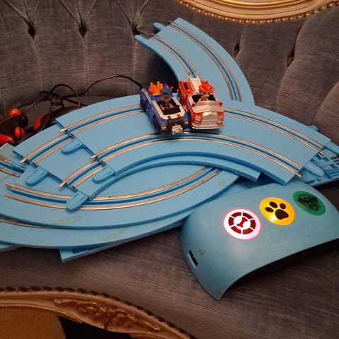Paw Patrol Carrera First On the Track bilbane med elektriske biler. Banen er ca. 2,4 meter lang og formet som en åttetallsløype. Settet inkluderer kjøretøy med figurer fra Paw Patrol-universet og passer for barn som liker bilbaner og figurlek.