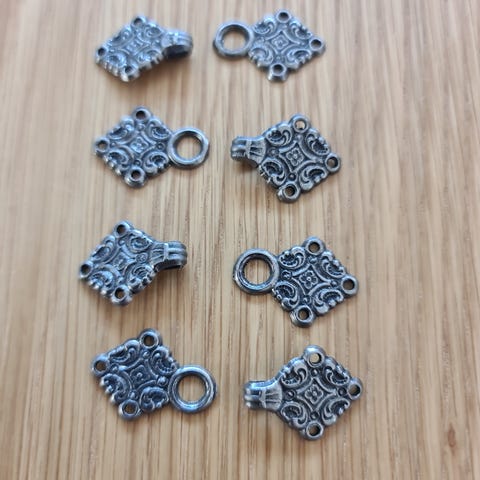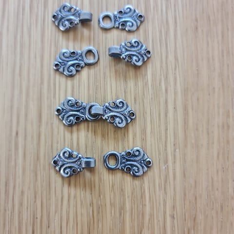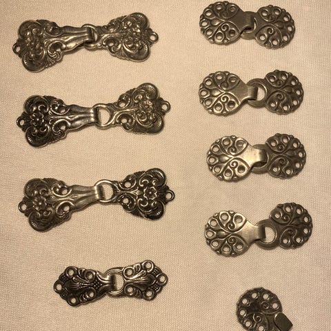Rydder etter nedlagt forretning og selger 5 sett tinnhekter 65 mm kr.70,- pr.sett Ny pris idag er kr.129 pr. sett. Kan hentes I Oslo eller sendes som brevpost kr.46,- eller fiks ferdig.