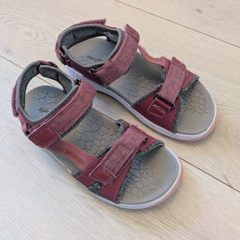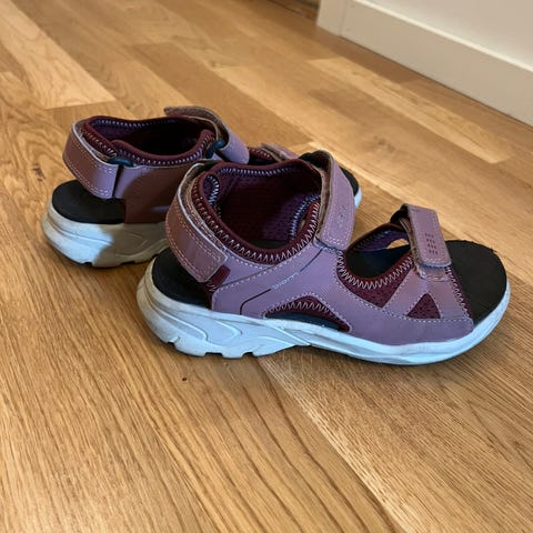 ECCO sandaler for barn i størrelse 27. Modellen er unisex og har justerbare borrelåsstropper over fot og rundt ankel for god tilpasning. Sandalene er i en lilla farge med lys såle og mønstret yttersåle for bedre grep. Passer til hverdagsbruk og utendørsaktiviteter i varmt vær.