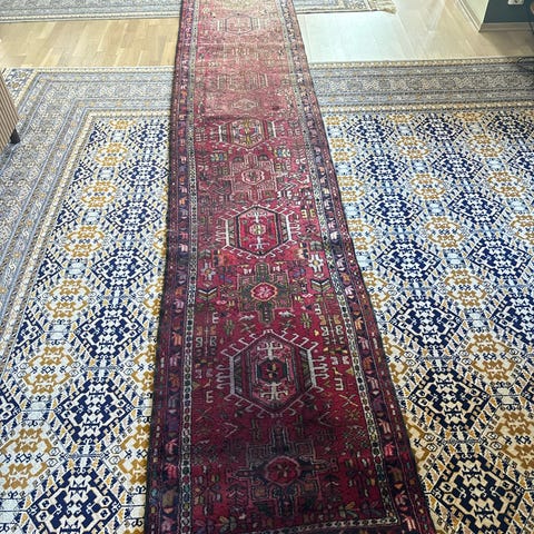 Godt vedlikeholdt og jevnlig renset persisk håndknytt teppe i ull og god kvalitet. Sjeldent og unikt mønster. Har fått sin patina etter ca 25 år brukt i en innergang. Kjøpt på Oslo glassmagasin rundt år 2000. Ren fin bakside