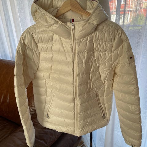 Vintage Moncler dun vinterjakke for dame i størrelse S. Jakken er hvit og vattert med dunfyll. Modellen har høy krage og avtagbar hette, samt flere utvendige lommer med glidelås og klaff. Klassisk Moncler-logo på brystlommen og karakteristiske detaljer langs glidelåsen. Egnet som varm ytterjakke i kaldt vær.