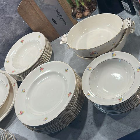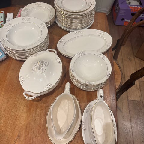 Benhvitt med rosa "strå" mønster og gullkant. 12 middag, 12 store suppe, 12 små suppe, 3 fat, 2 potet fat, 2 sausenebb, 1 suppe terrin. Alt uten skår, noen få deler er litt krakelert. 4 middags tallerkner er misfarget i midten. Selges samlet.