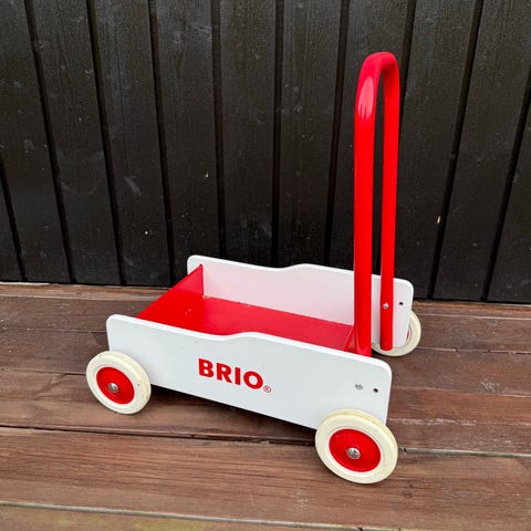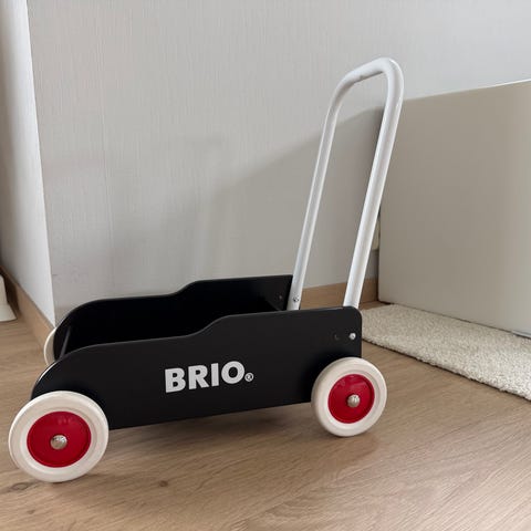 Pent brukt BRIO gåvogn i svart. Klassisk gåvogn med hvite hjul og røde felger, samt metallhåndtak. Passer som støtte når små barn skal øve på å gå og balansere.
