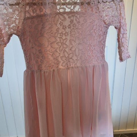H&M kjole for jente i størrelse 134. Kjolen er i rosa bomullsstoff og har kort erm. Den har knapper foran