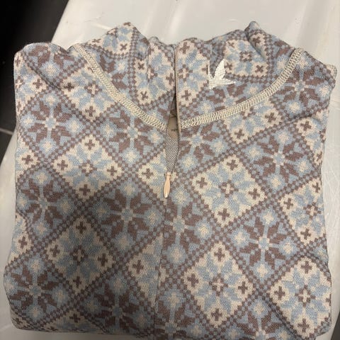 Kari Traa ulltrøye for dame i størrelse L. Trøyen har rund hals og lange ermer. Forsiden har blått, mønstret panel, mens rygg og ermer er ensfarget blå med kontrastsømmer i rosa. Materialet er en ullblanding (se vaske- og materiallapp på plagget for detaljert sammensetning). Egner seg som innerste lag til ulike aktiviteter og hverdagsbruk i kjøligere vær.