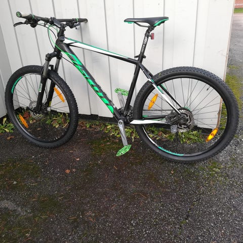 Scott scale 920 terrengsykkel med rammestrørrelse M og 29" hjul. Sykkelen har dempegaffel foran og er utstyrt med skivebremser. Rett styre med horn gir flere håndposisjoner. Sykkelen passer til terrengsykling og bruk på grus- og skogsstier. Egnet for voksne ryttere som passer en M-størrelse ramme og ønsker en 29" terrengsykkel.