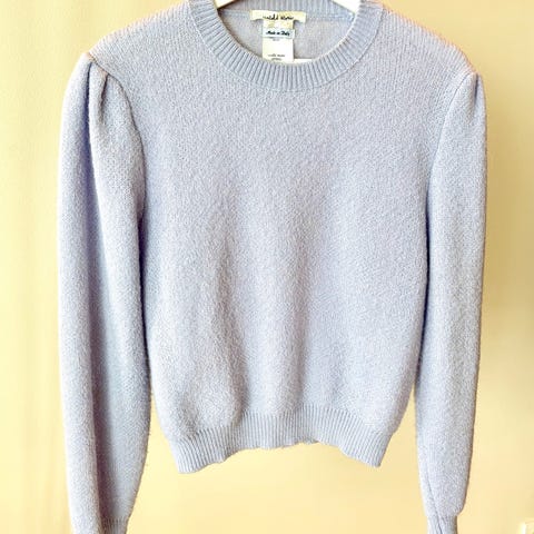 Untold Stories Florrie Puff Sweater genser for dame i størrelse S. Genseren er lilla og har rund hals og lange ermer med lett puffskulder. Materiale ifølge lappen: 47 % akryl, 27 % mohair og 26 % polyamid. Strikket struktur med ribbekanter nederst, i ermelinningene og i halsen. Produsert i Italia.
