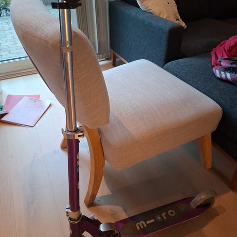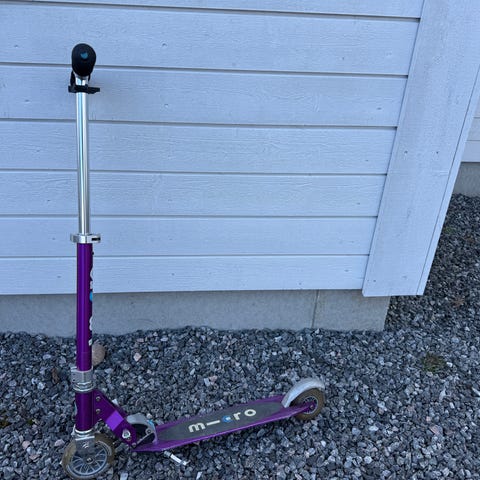 Micro sparkesykkel i lilla farge. Modellen har justerbart styre med polstrede håndtak og sammenleggbar konstruksjon for enkel oppbevaring og transport. Deck og ramme er i metall med to hjul og bremse bak. Egner seg for barn som ønsker en enkel og lett sparkesykkel til bruk på jevnt underlag.