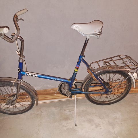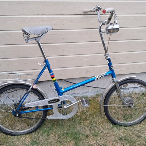 Sykkelen fikk jeg til min 13 årsdag. Svarte håndtak, da det opprinnelig var en coccinella( marihønesykkel) Den gamle ramma knakk i to, og jeg fikk tilsendt denne blå i fra fabrikk, mulig i 1975. Jeg tror at originalpumpa er inntakt, men har ikke sjekket. Kodelås, kattøye, lykt og dynamo er dessverre stjålet fra denne. Men, som delesykkel, restaureringdobjekt er den fullt brukbar. Må hentes i Elverum